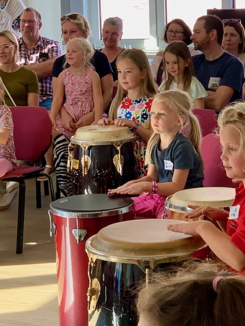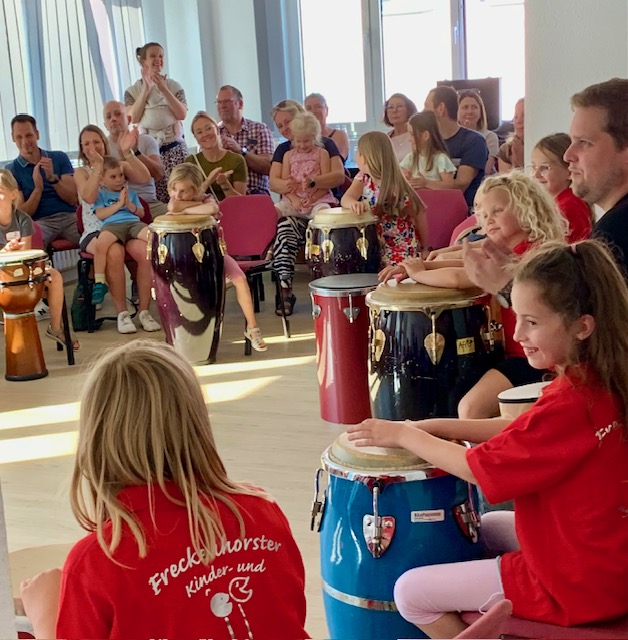 Ganz nebenbei lernten die Kinder das Erkennen und Übernehmen von Rhythmen, übten das Zusammenspiel und aufeinander Hören und die Einsatzmöglichkeiten der großen Auswahl der Klang- und Rhythmus-Instrumente.
